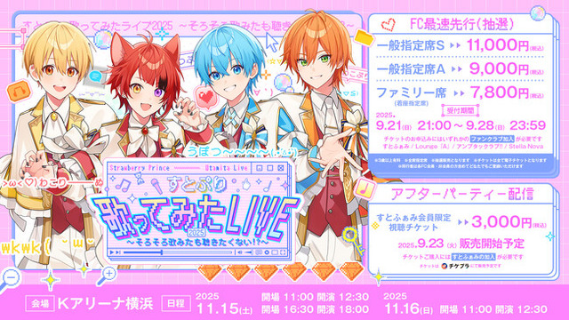 株式会社STPR(本社:東京都渋谷区、代表:柏原真人、以下STPR)は、当社所属の2.5次元アイドルグループ「すとぷり」が開催する『歌ってみたライブ2025』について、2025年9月21日(日)21:00より公式ファンクラブ最速先行(抽選)申込受付を開始したことをお知らせいたします。あわせて、STPR Familyからのゲスト3名の出演発表、「すとぷり」限定生配信『アフターパーティ配信』、そして『スペシャルグッズ付き指定席』に関する情報も公開いたしました。