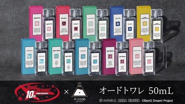 Poppin'Party、Afterglow、Pastel*Palettes、Roselia、ハロー、ハッピーワールド!、Morfonica、RAISE A SUILEN、MyGO!!!!!、Ave Mujica、夢限大みゅーたいぷをイメージしたA:code オードトワレの登場です。