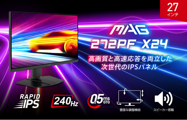 この度、エムエスアイコンピュータージャパン株式会社は2025年10月3日(金)より、ゲーミングモニターの新モデルを発売いたします。高いゲーミング性能とコストパフォーマンスに優れた『MAG』シリーズから、240Hzの高リフレッシュレートと応答速度0.5ms(GTG)を実現するRAPID IPSパネルを採用し、高性能スタンドによる柔軟な設置にも対応し、家庭用ゲーム機との親和性も高いスピーカー(2W + 2W)も搭載した「MAG 272PF X24」が新たにラインナップに加わります。
