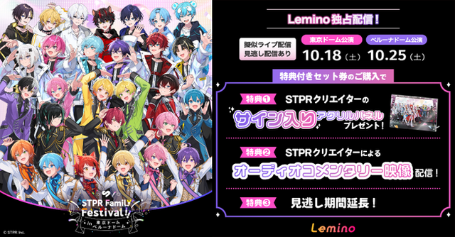 この度、この『STPR Family Festival!!』のライブ映像が映像配信サービス「Lemino」にて独占配信されることが決定!東京ドーム編は2025年10月18日(土)、ベルーナドーム編は10月25日(土)から配信開始となります。ご視聴方法は、ペイパービューにて両公演・東京ドーム編・ベルーナドーム編の3パターンをお選びいただけます。両公演をご視聴いただける『特典付きセット』には、1.ここでしか見られない映像、2.見逃し配信期間の延長の豪華特典がついています。さらに、『特典付きセット』ご購入者限定で、サイン入りアクリルパネルが当たるキャンペーンも実施されます。応募条件などの詳細はキャンペーンサイトをご確認ください。