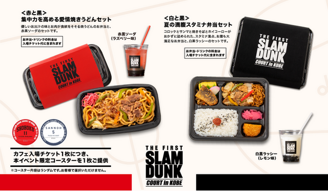 「THE FIRST SLAM DUNK」の歴代ポスターやグッズで装飾された店内では、作品とのコラボ弁当とドリンクをセットでご提供。メニューは、優しい出汁の味が染み渡る「集中力を高める愛情焼きうどん」と赤黒ソーダの<赤と黒セット>、またはコロッケ・サンマ・焼きそば・ホイコーロー等がおかずに詰められた「夏の満腹スタミナ弁当」と白黒ラッシーの<白と黒セット>のどちらかの予約制で、カフェ入場チケット1枚につき、本イベント限定コースターを1枚つけてご提供します。(※コースター内容はランダムです。お客様で選択いただけません)