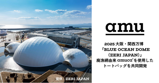 「漁具から、価値の常識をひっくり返す。」をミッションに、廃漁網の回収・リサイクルに取り組むamu株式会社は、循環型社会の実現を目指す団体、ZERI JAPANが2025年大阪・関西万博で出展するパビリオン「BLUE OCEAN DOME」で廃漁網由来生地「amuca(R)」を用いたトートバッグをZERI JAPANと共同開発しました。また、廃漁具をリサイクルしたサングラスも寄贈しています。