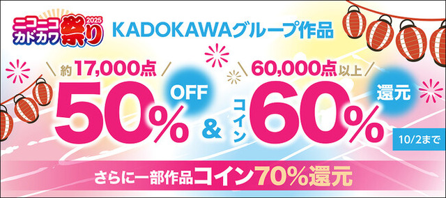株式会社ドワンゴは、総合電子書籍ストア「BOOK☆WALKER」にて、2025年9月26日(金)から10月2日(木)までの期間中、年に一度の大感謝セール「ニコニコカドカワ祭り2025」を実施します。