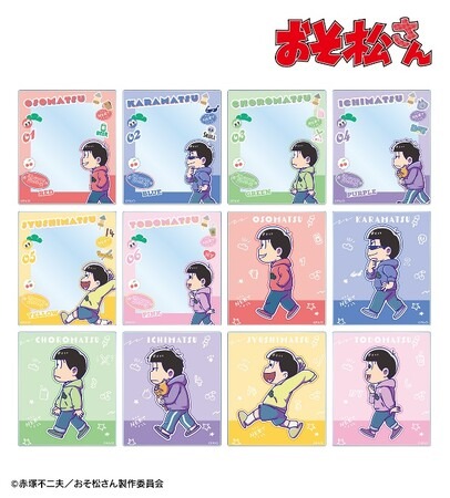 おそ松、カラ松、チョロ松、一松、十四松、トド松が歩いているちびキャラを新たに描き起こし、キャラクターモチーフをデザインしたアクリルカードに仕上げました。
