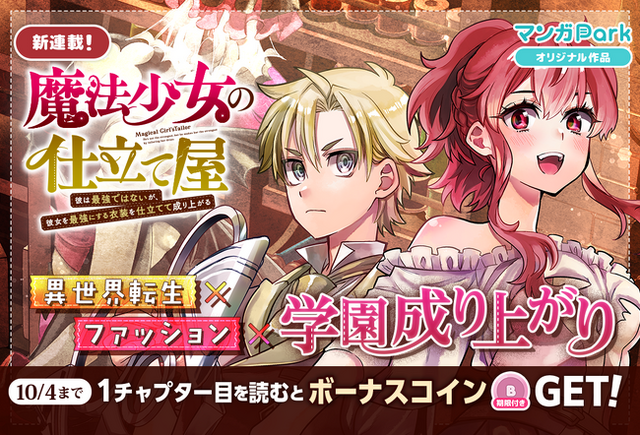 マンガParkでは「魔法少女の仕立て屋~彼は最強ではないが、彼女を最強にする衣装を仕立てて成り上がる~」の新連載を記念して、読書チャレンジキャンペーンを実施いたします。期間限定&読めば必ずコインがもらえるBIGチャンス!1チャプター目を読むと