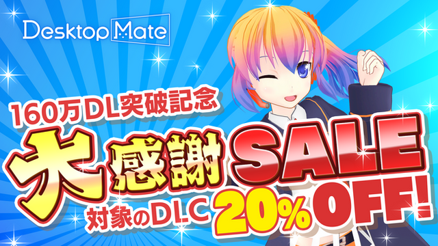 「Desktop Mate」は2025年1月8日の配信開始以降、約8ヶ月という期間で160万ダウンロードを突破いたしました。前回の150万ダウンロード達成からわずか2ヶ月での快挙となり、継続的なご支援をいただいている皆様に心より感謝申し上げます。