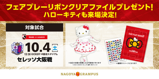 「ハローキティ」来場に伴いグリーティング以外にも、名古屋グランパスバージョンの「フェアプレーリボン クリアファイル」来場者全員プレゼントや、ファンクラブ会員限定の写真撮影会、「フェアプレーリボンプロジェクト」フォトスポット設置、ハローキティオリジナルグッズ販売などを実施いたします。
