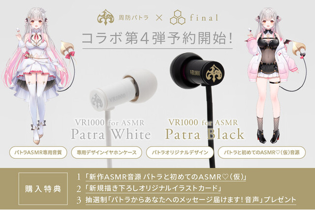 国内オーディオメーカー株式会社final(代表:細尾 満、本社:神奈川県川崎市)は、超大人気VTuber「周防パトラ」とのコラボレーション企画第4弾、初の有線イヤホン「VR1000 for ASMR Patra White/Patra Black」の予約を、本日2025年10月3日(金)よりfinal公式ストア(WEB)にて開始いたしました。