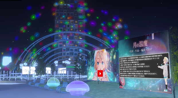 バーチャル宮下公園では、水族館をイメージした海の生き物が漂う空間を体験できます。参加者のアバターはクラゲをイメージしたものとなっており、水族館の一部となって回遊することになります。また渋谷音楽祭と連動し、JELEEの楽曲がBGMとして流れるなかアニメPVや楽曲MVが展示されます。