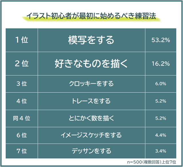 「イラスト初心者が最初に始めるべき練習法」を聞いたところ、圧倒的1位は「模写をする(53.2%)」でした。2位「好きなものを描く(16.2%)」、3位「クロッキーをする(6.0%)」が続きます。