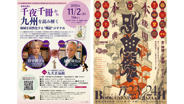 松岡正剛が校長を、田中優子が学長を務めるイシス編集学校は、2000年の創設以来、情報編集力を多彩に学ぶカリキュラムを提供してきました。松岡正剛自身が壮大なブックナビ「千夜千冊」を執筆し、多くの書籍を出版してきた著述家であり編集者であることから、イシス編集学校では、書籍を様々な形で学びに活用する文化が根付いています。2025年11月には、福岡、東京にて、新しい「本の祭典」を初開催します。