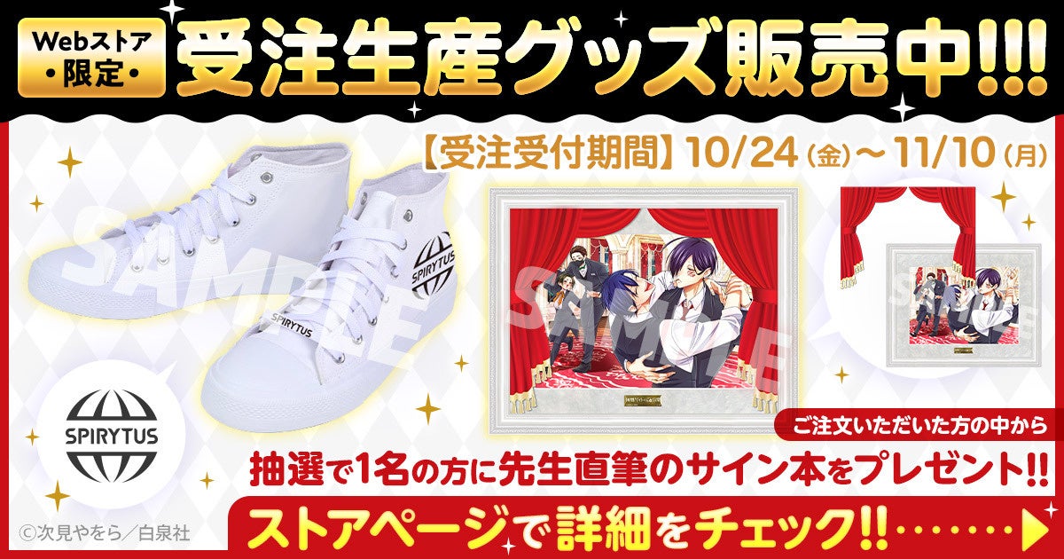 10月24日から11月10日までの期間、ヤングアニマルWebストアにて予約注文をいただいた方に、『拷問バイトくんの日常』7巻と、描きおろしイラストを使用した高精細複製原画や特製スニーカーのセットをお届けします。
