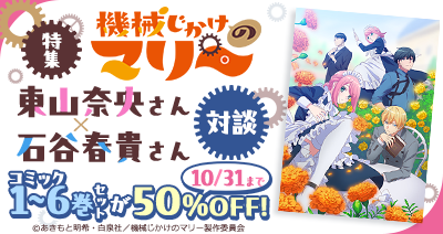 6,000作品以上のアニメが見放題(※)の「dアニメストア」( https://animestore.docomo.ne.jp/ )では、10月から見放題先行配信中のTVアニメ「機械じかけのマリー」の特集記事を公開中です。マリー役・東山奈央さんとアーサー役・石谷春貴さんによる対談の他、10月31日(金)までの期間限定で、同作品のコミック1~6巻セットが50%OFFで購入できるキャンペーンを開催しています。