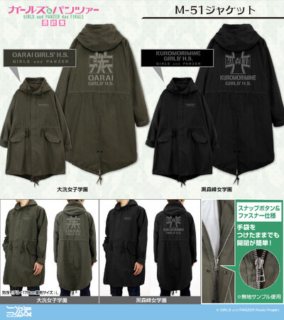 「大洗女子学園」「黒森峰女学園」のM-51ジャケット、ジップパーカー、ニュースペーパーバッグなどが二次元コスパから新登場。