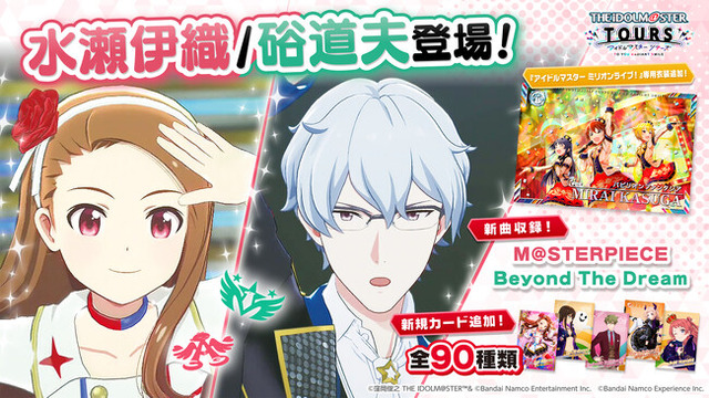 「水瀬伊織」・「硲道夫」の2名が新たに登場し、楽曲『M@STER PIECE』・『Beyond The Dream』を追加します。第3弾では、「水瀬伊織/rabbit on the moon」や「硲道夫/LESSON 1」をはじめとする、『アイドルマスター TOURS』ならではの描き下ろしカードが90種登場します。
