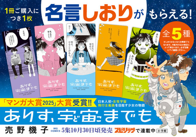「マンガ大賞2025」の大賞受賞作『ありす、宇宙までも』(著:売野機子)の最新第5巻が、2025年10月30日(木)に発売予定です。これを記念して、全国のフェア参加書店にて、『ありす、宇宙までも』のコミックスを1冊買うごとに、作中の名言を使用した【名言しおり】(全5種)がもらえる書店フェアを、10月29日(水)より順次開催いたします。