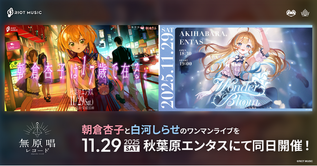 株式会社RIOT MUSIC(本社:東京都港区、代表取締役:舩橋 純、読み:ライオットミュージック、以下「RIOT MUSIC」)は、同社が運営するVSingerレーベル「無原唱レコード」に所属するバーチャルアーティスト「朝倉杏子」と「白河しらせ」が、2025年11月29日(土)に秋葉原エンタスにてワンマンライブを同日開催いたします。また、10月28日(火)18時より現地チケットの先着販売を開始したことも併せてお知らせいたします。