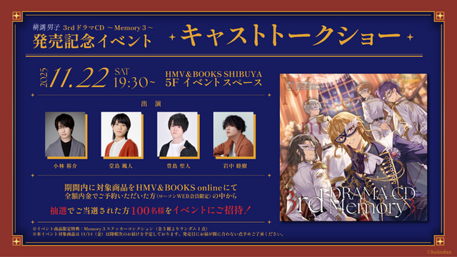 2025年11月22日(土)に、株式会社アース・スター エンターテイメントは3rdドラマCD ~Memory 3~の発売を記念したリリースイベントをHMV&BOOKS SHIBUYA 5Fイベントスペースで開催!小林裕介、堂島颯人、豊島聖人、岩中睦樹がトークショーに出演します!