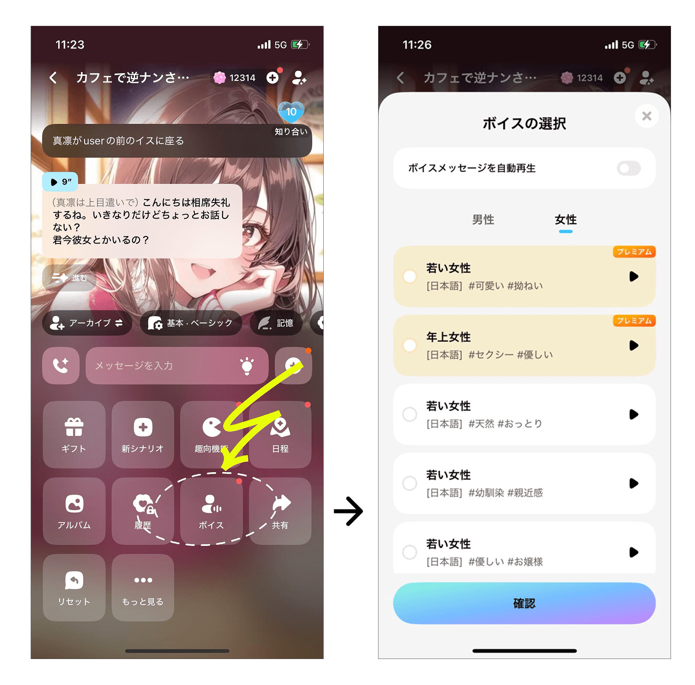 これまではキャラクターの作者様しか設定できなかったボイスが、全てのユーザー様に解放されました。お気に入りのキャラクターに最適なボイスを自由に選び、より自分好みの会話体験をお楽しみいただけます。設定方法は簡単で、チャット画面右下にある「+」メニューから「ボイス」を選ぶだけです。2. ボイスの自動再生機能を追加