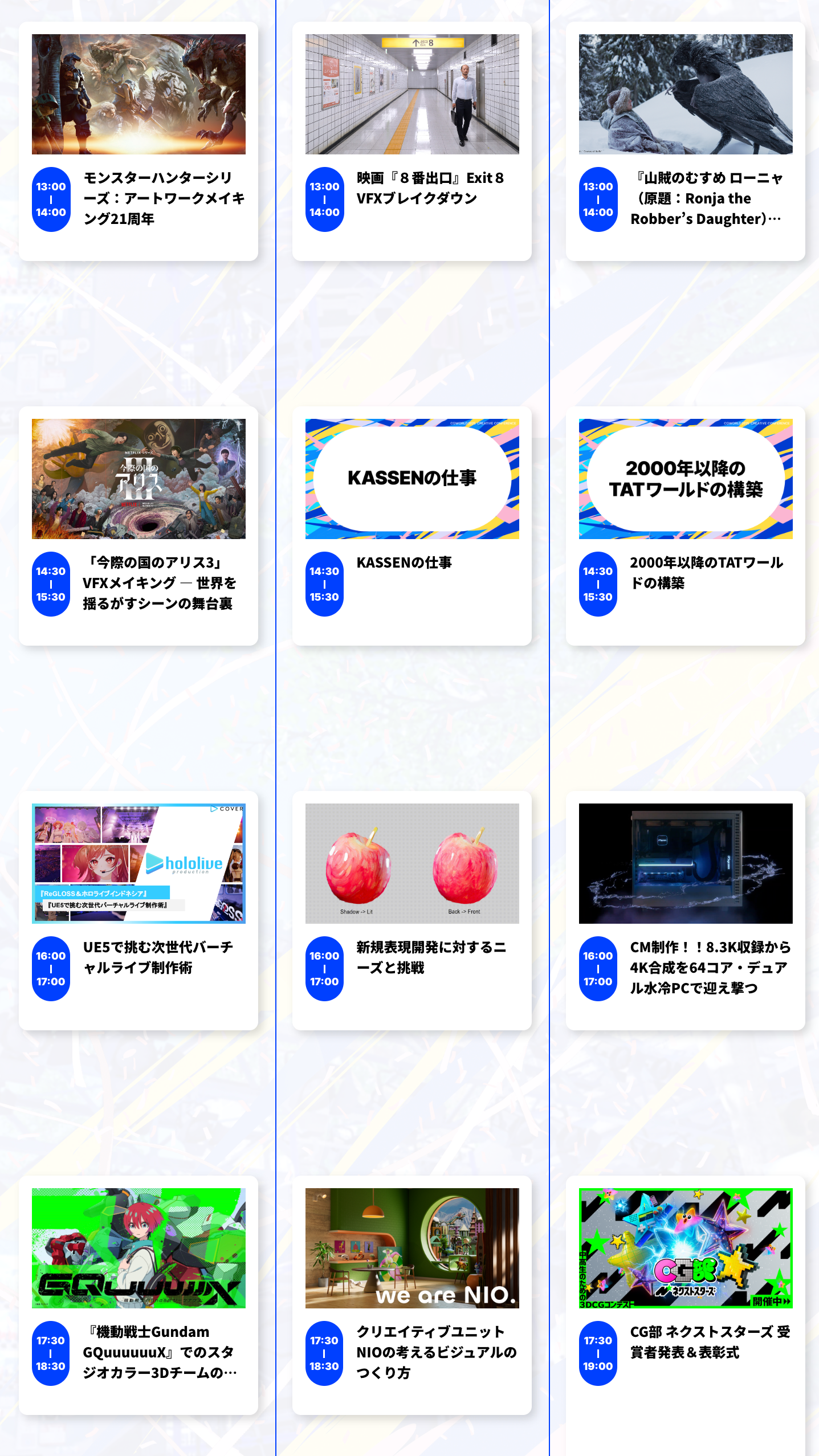 3つの大会場で実施するセッション情報を全公開!『機動戦士Gundam GQuuuuuuX』や『クリエイティブユニットNIOの考えるビジュアルのつくり方』、『KASSENの仕事』、中高生のための3DCGコンテスト『CG部 ネクストスターズ 受賞者発表&表彰式』など、バラエティ豊かな12セッションの情報が出揃いました。