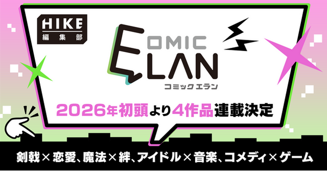 株式会社HIKE(本社:東京都新宿区、代表:三上 政高、以下「HIKE」)の電子漫画出版事業を担う「HIKE編集部」は、少年/青年向け作品を中心に扱うレーベル「COMIC ELAN」(コミックエラン)にて4作品を2026年初頭から連載開始することを決定いたしました。連載作品のジャンルは剣戟×恋愛、魔法×絆、アイドル×音楽、コメディ×ゲームとなります。作品タイトルや詳細については、後日改めて発表予定です。続報にご期待ください。
