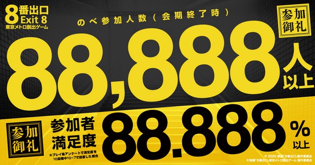 ESCAPE合同会社(所在地:東京都品川区、統括プロデューサー 佐々木 翼)は、ESCAPE.IDにて販売を行っていた周遊謎解きイベント『映画「8番出口」東京メトロ脱出ゲーム』(広域屋内周遊型)が、2025年11月3日で会期を終了したことをお知らせいたします。