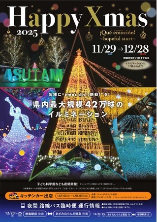 あすたむらんど徳島の園内をイルミネーションで華やかに彩り、冬の特別なひとときを演出する【Happy Xmas 2025】。