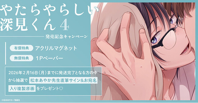 ホーリンラブブックスでは松本あやか先生最新コミックス『やたらやらしい深見くん(4)』発売を記念して、豪華キャンペーンを実施いたします!
