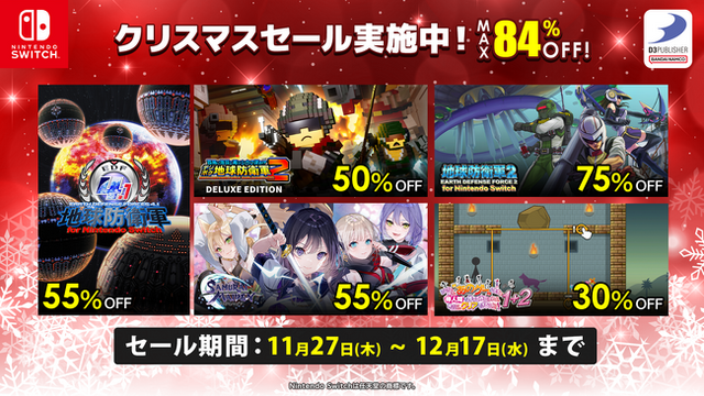 株式会社ディースリー・パブリッシャーは、人気のNintendo Switch(TM)用ソフトが最大84%で購入できる、お得なクリスマスセールを実施中です。