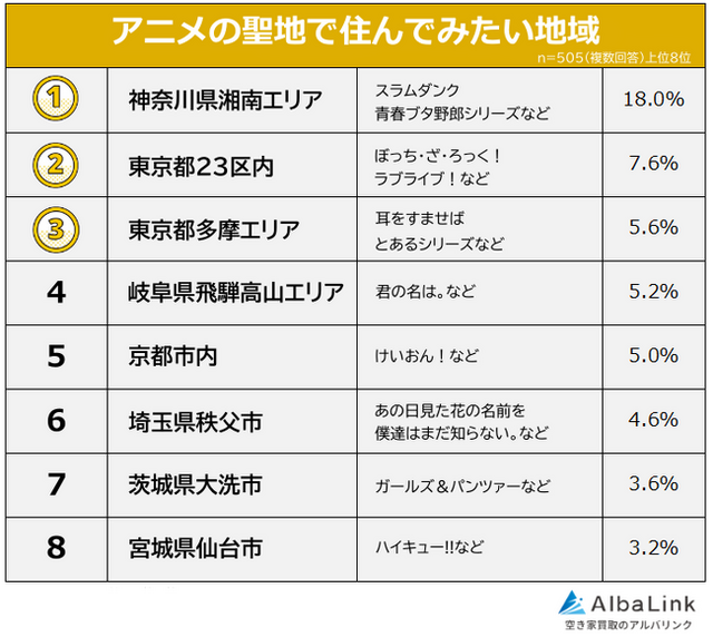 今回、株式会社AlbaLink( https://albalink.co.jp/)が運営する訳あり物件買取ナビ( https://albalink.co.jp/realestate/)は、アニメが好きな505人を対象に「アニメの聖地で住んでみたい地域」についてアンケート調査を実施しました。