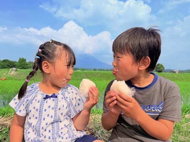 青い空、白い雲!祖父母の米作りを通して命の大切さに触れた兄妹が、豊かな自然に包まれて、おいしそうに頬張る姿がかわいらしいですね。未来への希望が詰まっています。