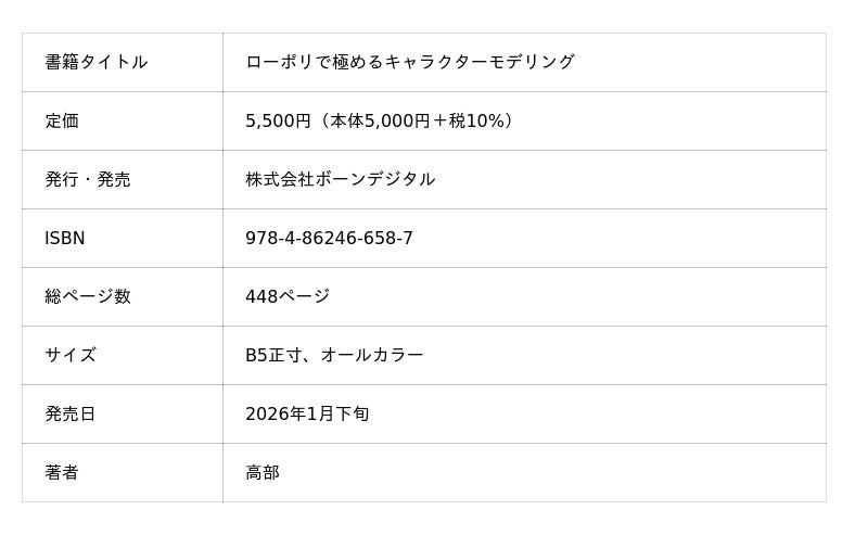株式会社ボーンデジタル(本社:東京都千代田区、CEO:新 和也、URL:https://www.borndigital.co.jp)は、『ローポリで極めるキャラクターモデリング』(著:高部)を2026年1月下旬に発売いたします。