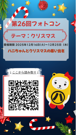 公式キャラクター「ハニちゃん」と一緒に写真撮影を楽しめる、参加型のARフォトコンテストです。ARを起動して撮影した写真をSNSに投稿するだけで、どなたでも気軽に参加できます。第26回となる今回はクリスマス編として、街中のイルミネーションはもちろん、ご自宅のツリーやリースなど身近なクリスマス小物でも撮影可能。年末ならではの思い出を、ハニちゃんと一緒に写真に残せる企画です。