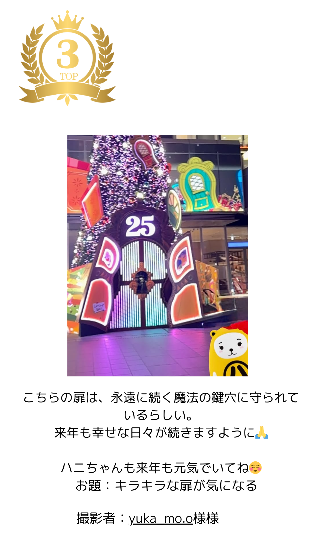 今回の入賞作品は、いずれも「ハニちゃん×イルミネーション」というテーマを的確に捉えながら、それぞれ異なる視点でクリスマスの魅力を表現している点が印象的でした。カフェでのひとときや身近なツリー、物語性を感じさせる象徴的な扉など、日常の風景にARキャラクターを自然に溶け込ませ、写真を見る人の想像力を広げています。ARならではの楽しさと、年末ならではのあたたかさが共存した作品として高く評価されました。
