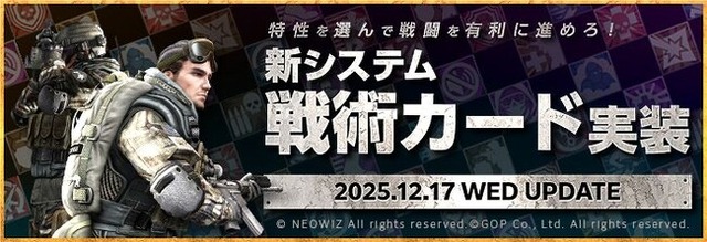 株式会社G・O・P[本社:東京都新宿区、代表取締役社長:申 載明 (シン・ジェミョン)]は、PC向けオンラインFPS『Alliance of Valiant Arms』(アライアンス オブ ヴァリアント アームズ、以下『AVA』)において、新規システム「戦術カード」を実装するアップデートを、2025年12月17日(水)に実施いたしました。