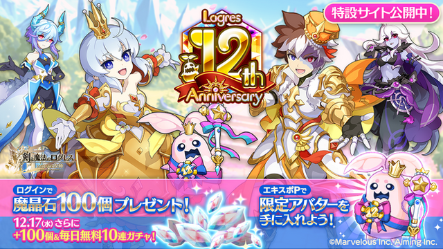 [画像7: https://prcdn.freetls.fastly.net/release_image/16719/2183/16719-2183-6db2477474accfb918f57415c0754bea-1200x675.png?width=536&quality=85%2C75&format=jpeg&auto=webp&fit=bounds&bg-color=fff ]今ログレスを始めるor戻ってくると、魔晶石50個と「12周年記念ガチャチケット」100枚をプレゼント!