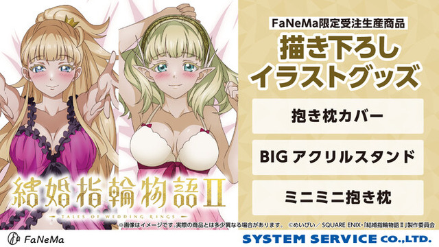 システムサービス株式会社(本社:東京都豊島区、代表取締役社長:田村宗弘)は、アニメ・マンガ・ゲーム作品等のキャラクター商品の企画・製作・販売をする自社ECサイト「FaNeMa」(URL:https://fanema.jp/)にて、『結婚指輪物語II』より「抱き枕カバー」「ミニミニ抱き枕」「BIGアクリルスタンド」を発売いたします。