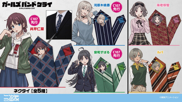 アニメ『ガールズバンドクライ』より、仁菜たちそれぞれの「ネクタイ」をはじめ、トゲナシトゲアリ5人の「オールプリントTシャツ」、アー写をイメージしたトゲトゲメンバーたちの「120cmビッグタオル アー写Ver.」が二次元コスパから登場です。