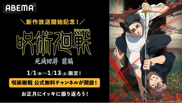 新しい未来のテレビ「ABEMA」は、2026年1月より放送されるTVアニメ『呪術廻戦』死滅回遊 前編の放送開始を記念して、2026年1月1日(木)より、『呪術廻戦』公式無料チャンネルを期間限定で初開設いたします。