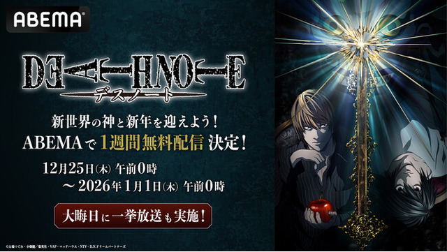 新しい未来のテレビ「ABEMA」は、年末年始の特別企画として、2025年12月25日(木)午前0時から年越しの瞬間2026年1月1日(木)午前0時まで、大人気アニメ『DEATH NOTE -デスノート-』を全話無料配信いたします。