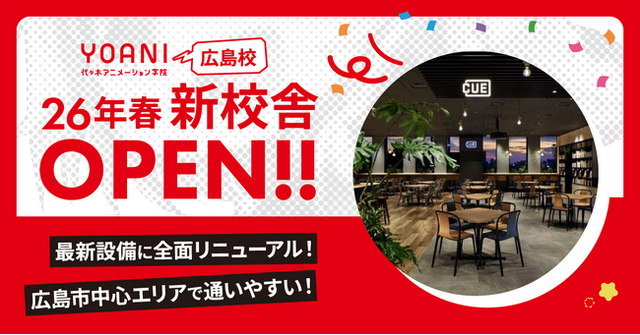 株式会社代々木アニメーション学院(本社:東京都千代田区 代表取締役社長:橋本 大輝)は、2026年春に代々木アニメーション学院 広島校を新校舎へ移転することをお知らせします。