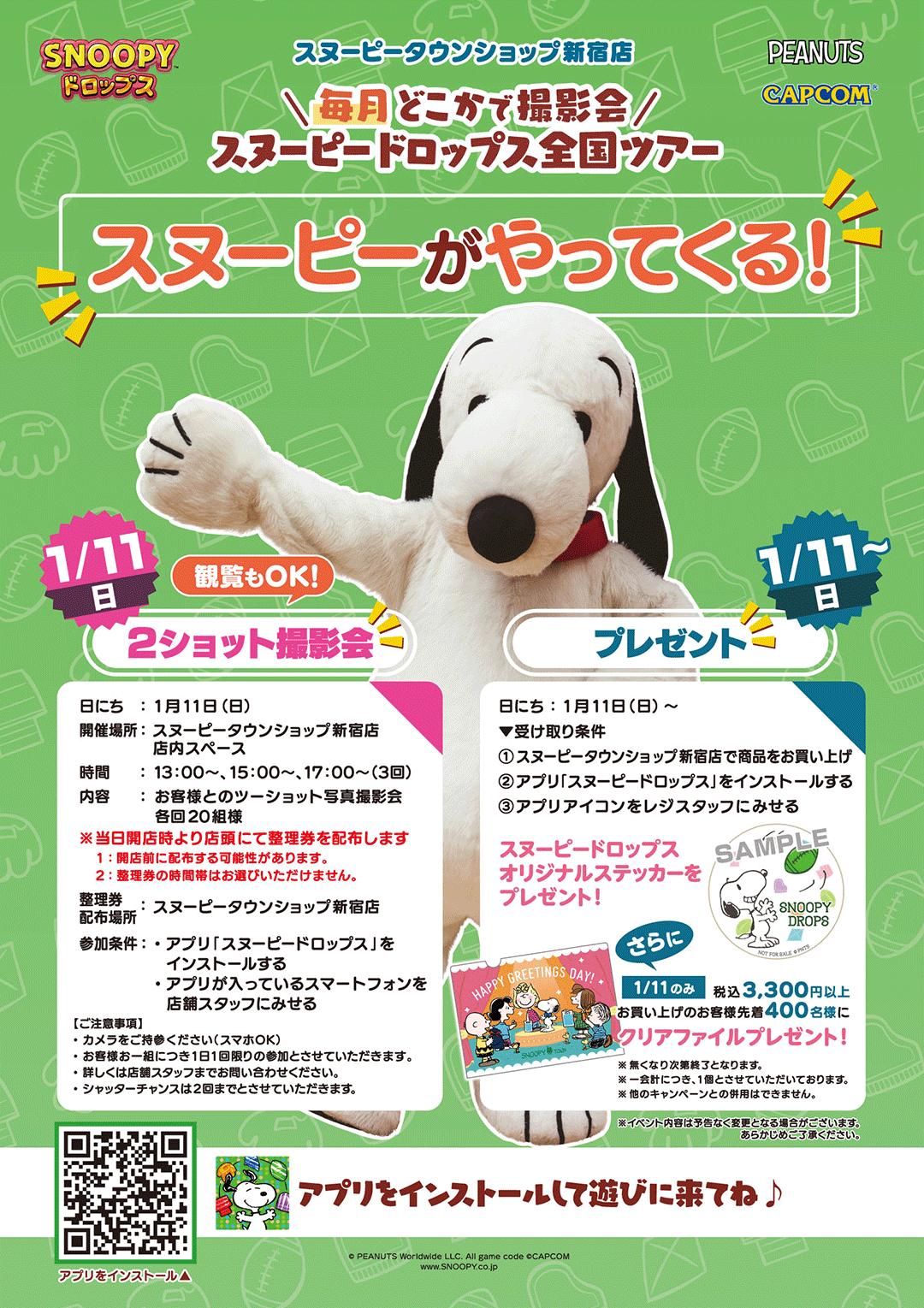 撮影会当日より、レジにて商品お買い上げの際に『スヌーピードロップス』のアプリアイコンを見せると、「スヌーピードロップス オリジナルステッカー」がもらえます!