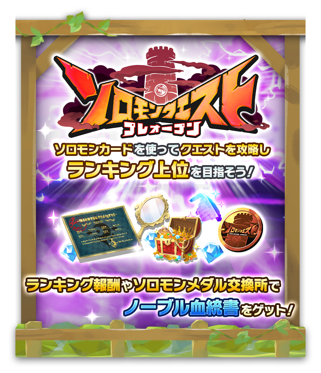 イベント「ソロモンクエスト」を開催中です。「ソロモンクエスト」は、毎月下旬に登場する新たな大型バトルイベントです。これまでの1対1バトルとは異なり、複数のモンスターで挑むパーティーバトル形式です。プレイヤーは、各地のブリーダー協会が選抜した特別なモンスター「勇者モン」とともに、4つの距離(零/近/中/遠)に分かれたクエストへ挑めます。「ソロモンクエスト」で手に入る「ソロモンの宝」をセットしてモンスターを育成すると、ソロモン秘伝を持つ「マスモン」を確実に入手できます。「マスモン」をお供に連れて、クエストの最終目標である「封印の塔」を目指しましょう。※今月のソロモン秘伝は「ソロモンの鍵(師走)」として獲得できます