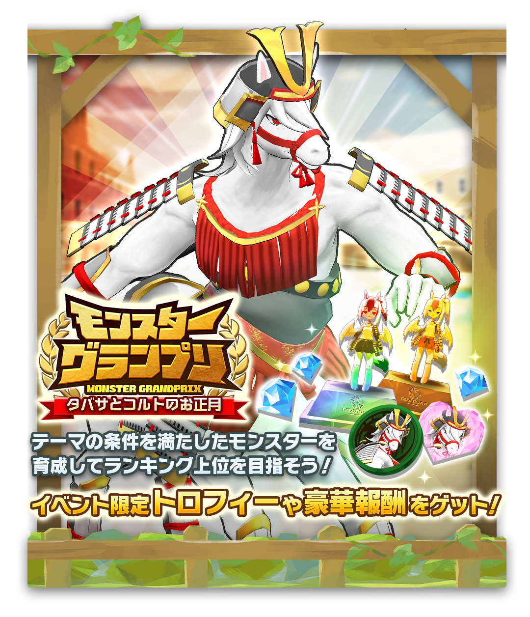 「モンスターグランプリ 『タバサとコルトのお正月』」を開催します。前半、後半で3つずつ用意されたテーマに沿ってモンスターを育成完了し、「いいね(総合力を元にしたポイント)」でランキングを競います。月の前半、後半を合算した総合ランキングにより獲得できる専用トロフィーには総合ランキングの順位が保存され、いつでも確認することができます。イベントの詳細はゲーム内にてご確認ください。【ストーリーあらすじ】