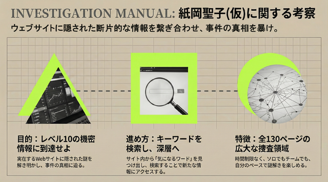 プレイヤーは、“紙岡聖子”と呼ばれる「同じ顔の女」について、実在するWebサイトで調査を行い、物語の真相を解き明かしていきます。歴史に散りばめられた「同じ顔の女」――紙岡聖子。その名はあくまで仮称であり、誰もその正体を知らない。分かっているのは、同じ「顔」だけです。