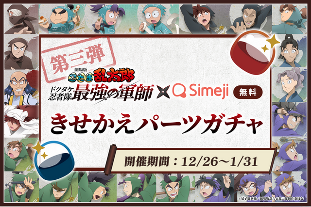 バイドゥ株式会社(本社:東京都港区、代表取締役社長:Feng Jiang)が提供するきせかえ顔文字キーボードアプリ「Simeji」(iOS、Android版)は、2025年12月26日(金)より『劇場版 忍たま乱太郎 ドクタケ忍者隊 最強の軍師』(以下、『劇場版 忍たま乱太郎』)とのコラボキャンペーン第3弾「きせかえパーツガチャ」を実施いたします。