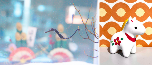 【(左)“海の馬”シーホース(タツノオトシゴ)の干支水槽、(右)クラフトアクアリウムで描初めできる、素焼きの馬 イメージ】