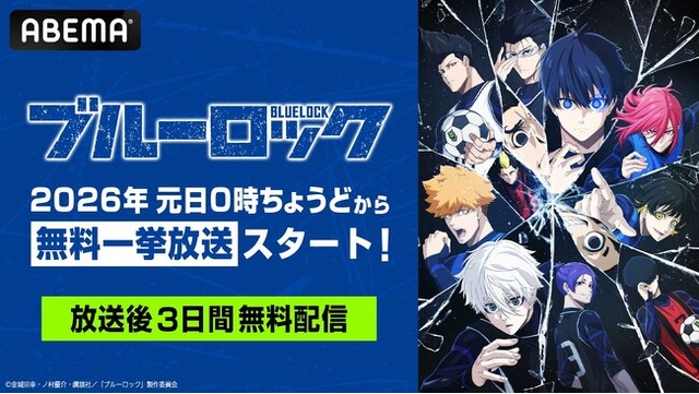 新しい未来のテレビ「ABEMA」は、大人気サッカーアニメ『ブルーロック』シリーズのTVアニメ全話を、2026年1月1日(木)に無料一挙放送いたします。