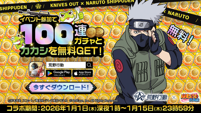 NetEase Gamesが開発・運営する大人気バトルロワイヤルゲーム『荒野行動』では、2026年1月1日から1月15日まで、『NARUTO-ナルト- 疾風伝』と初のコラボイベントが開催されます。ナルト、サスケ、サクラ、カカシなどの人気キャラクターが荒野行動に登場。木ノ葉隠れの里の忍者たちと共に新年を盛り上げます!