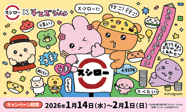 CHOCOLATE Inc.(本社:東京都渋谷区、代表取締役:渡辺裕介)は、弊社が日本展開を手がける韓国発キャラクター「チェゴシム(최고심)」と、株式会社あきんどスシロー(本社:大阪府吹田市、代表取締役社長:新居耕平)が展開するスシローとのコラボキャンペーンが、1月14日より全国のスシロー(※1)にて実施されることをお知らせいたします。